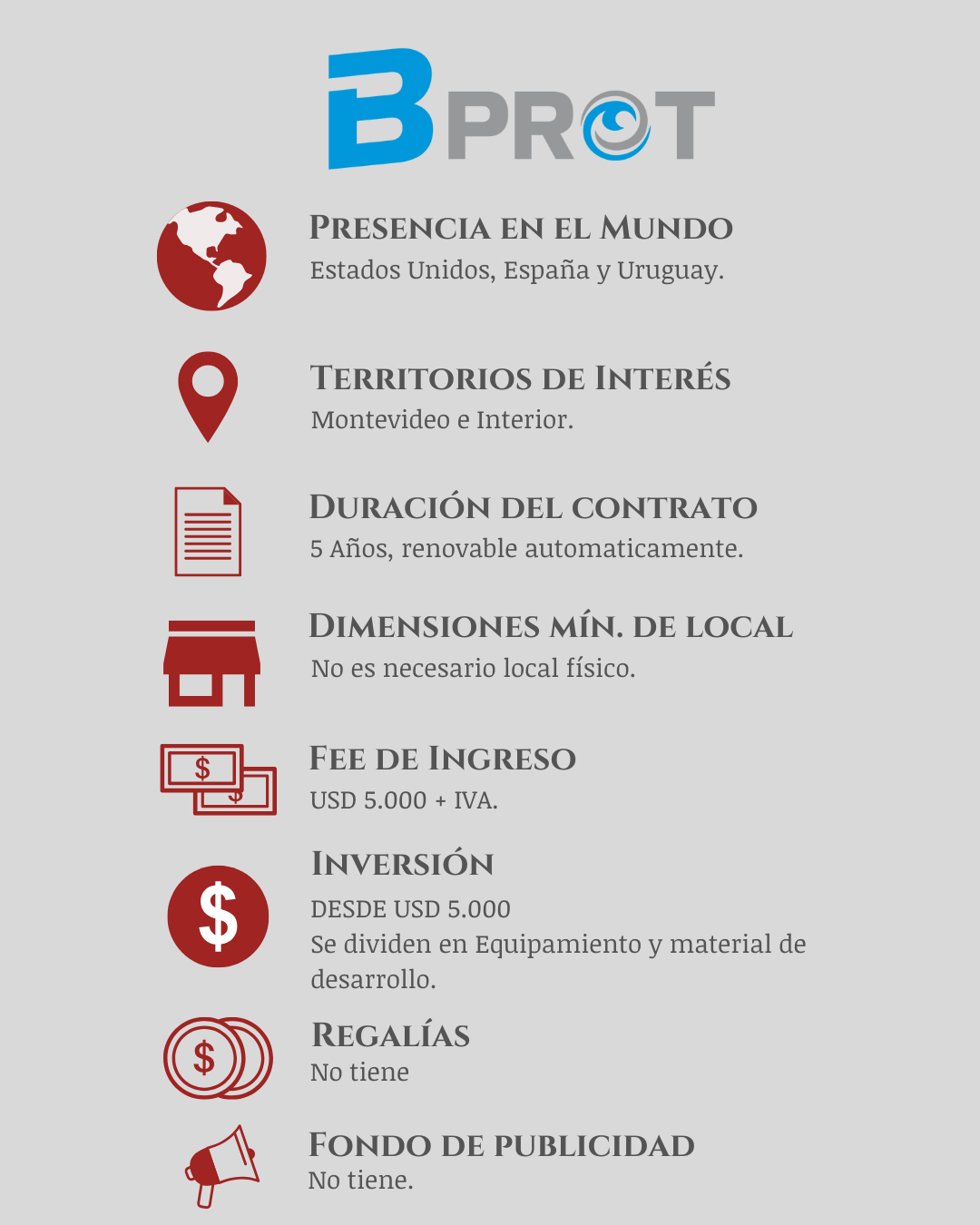 - Exclusividad de clientes: BPROT tiene un sistema franquiciado único donde no tienes un territorio que no te deje crecer, sino que todos los territorios pueden ser tuyos ya que tu exclusividad es por clientes, no por territorio.