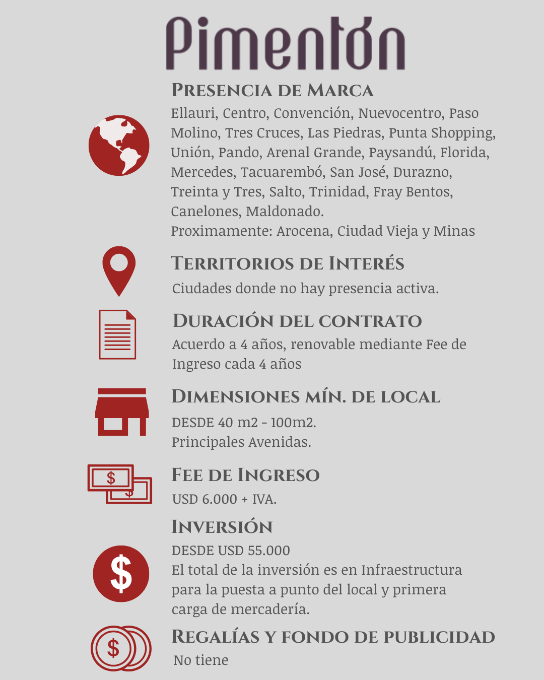 El sistema de franquicias de PIMENTÓN permite a los franquiciados instalar locales de la marca en los diversos puntos del país y en el exterior con un apoyo integral de Pimentón.